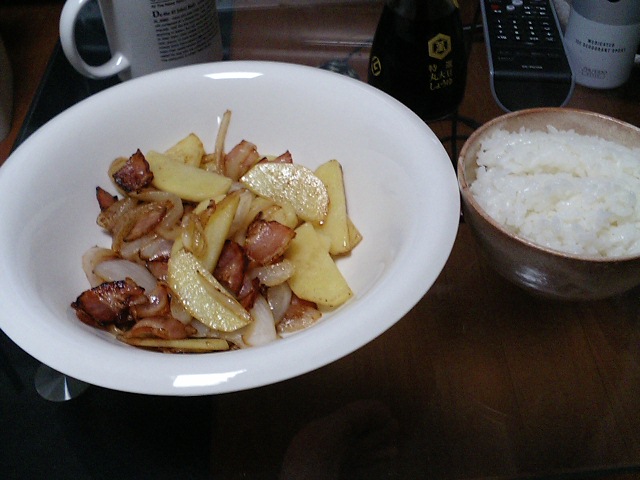 と言っても、ベーコンとタマネギとジャガイモを切って炒めただけですがw